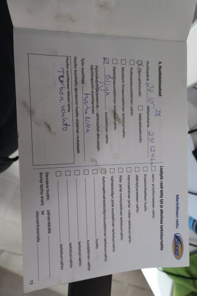 - Turbo uusittu 231tkm kohdalla, 10/2025
