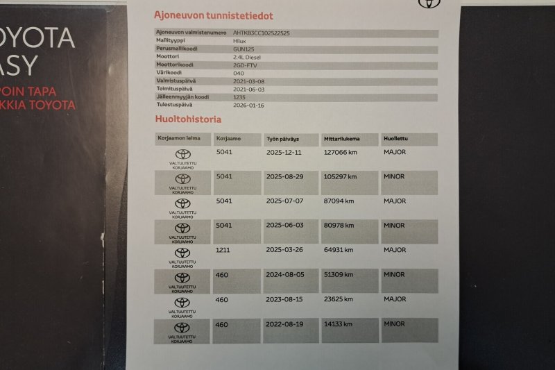 - Viimeisin huolto tehty 11.12.2025/127 066 km