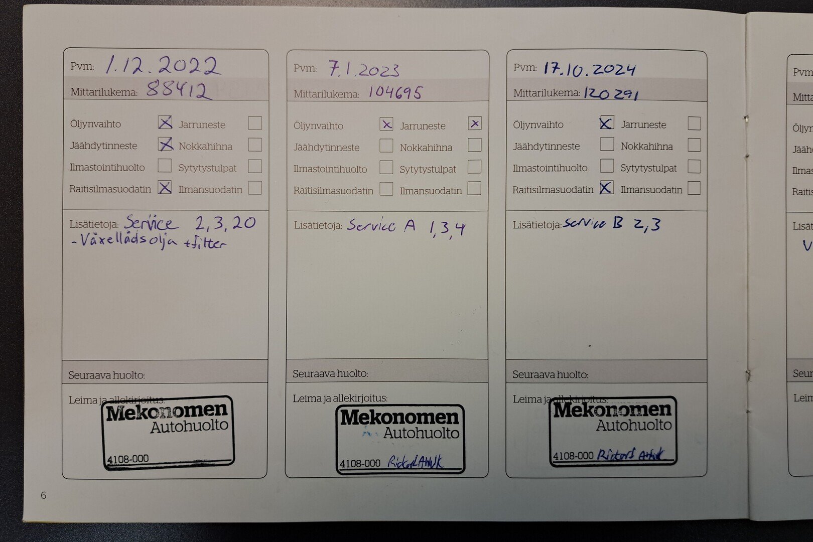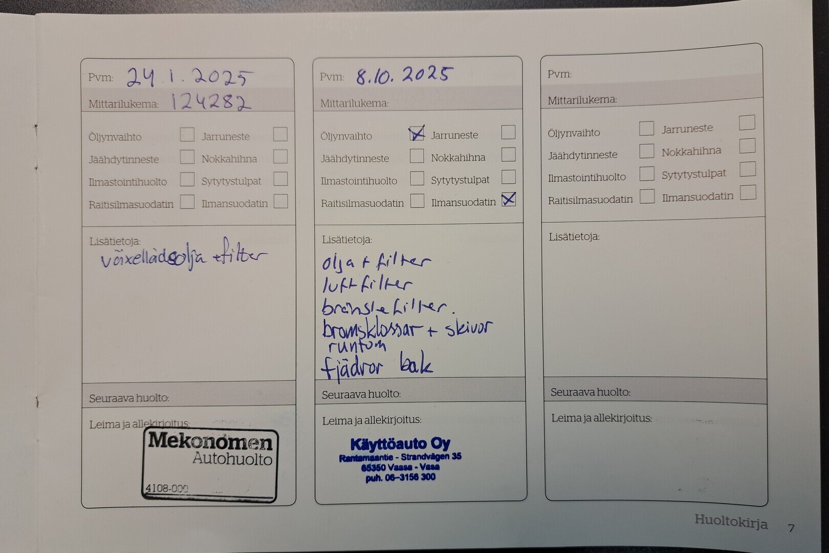 - Viimeisin huolto tehty 8.10.2025