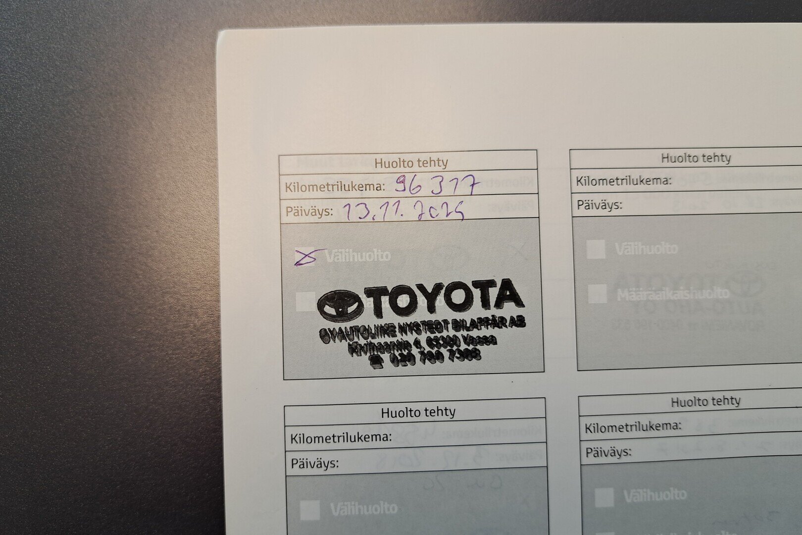 - Viimeisin huolto tehty 96tkm kohdalla, 11/2025