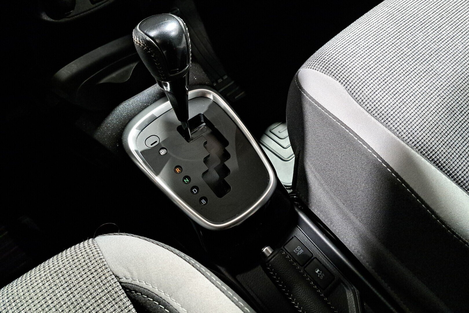 - Istuimien lämpimänharmaa/musta kangasverhoilu